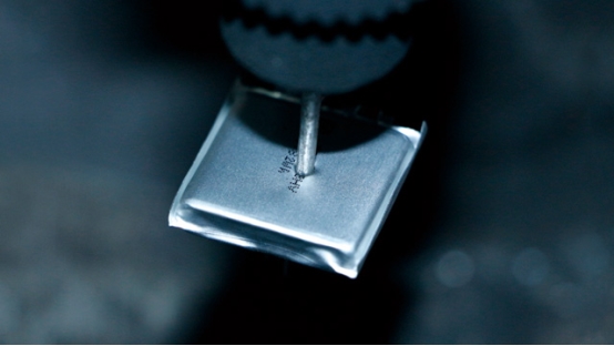 电池刺穿实验:直径2.5mm钢钉瞬间刺穿电池,电池不起包、不起火、不爆炸,安全有保障。